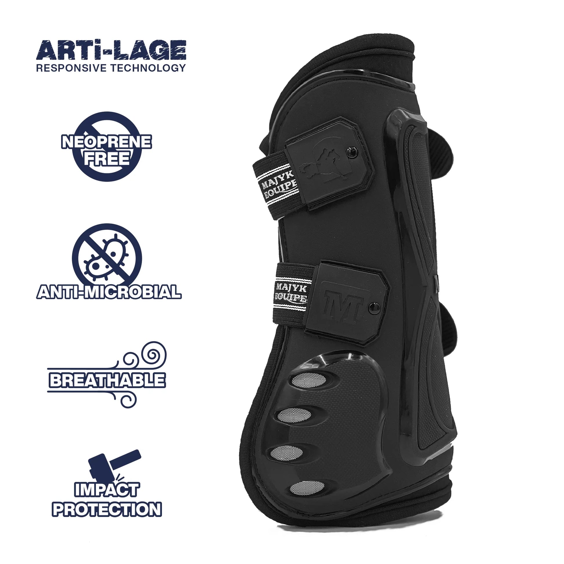 Inside the dual density strike guard is ARTi-LAGE™, a proprietary dilatant material, only found in Majyk Equipe Boots to provide a secondary layer of protection. Soft and pliable during normal exercise, the molecules change composition, hardening to form an instant protective barrier when struck.
