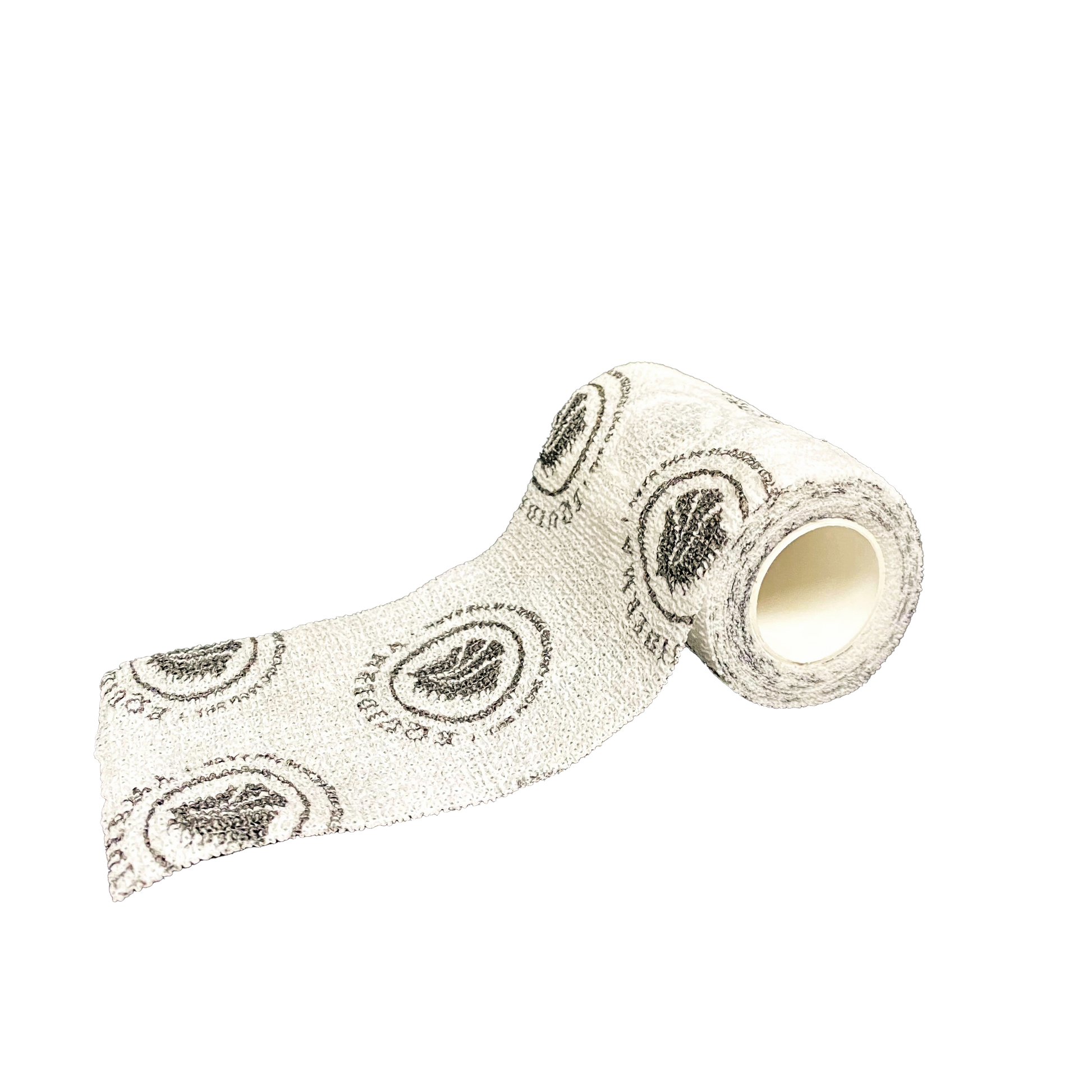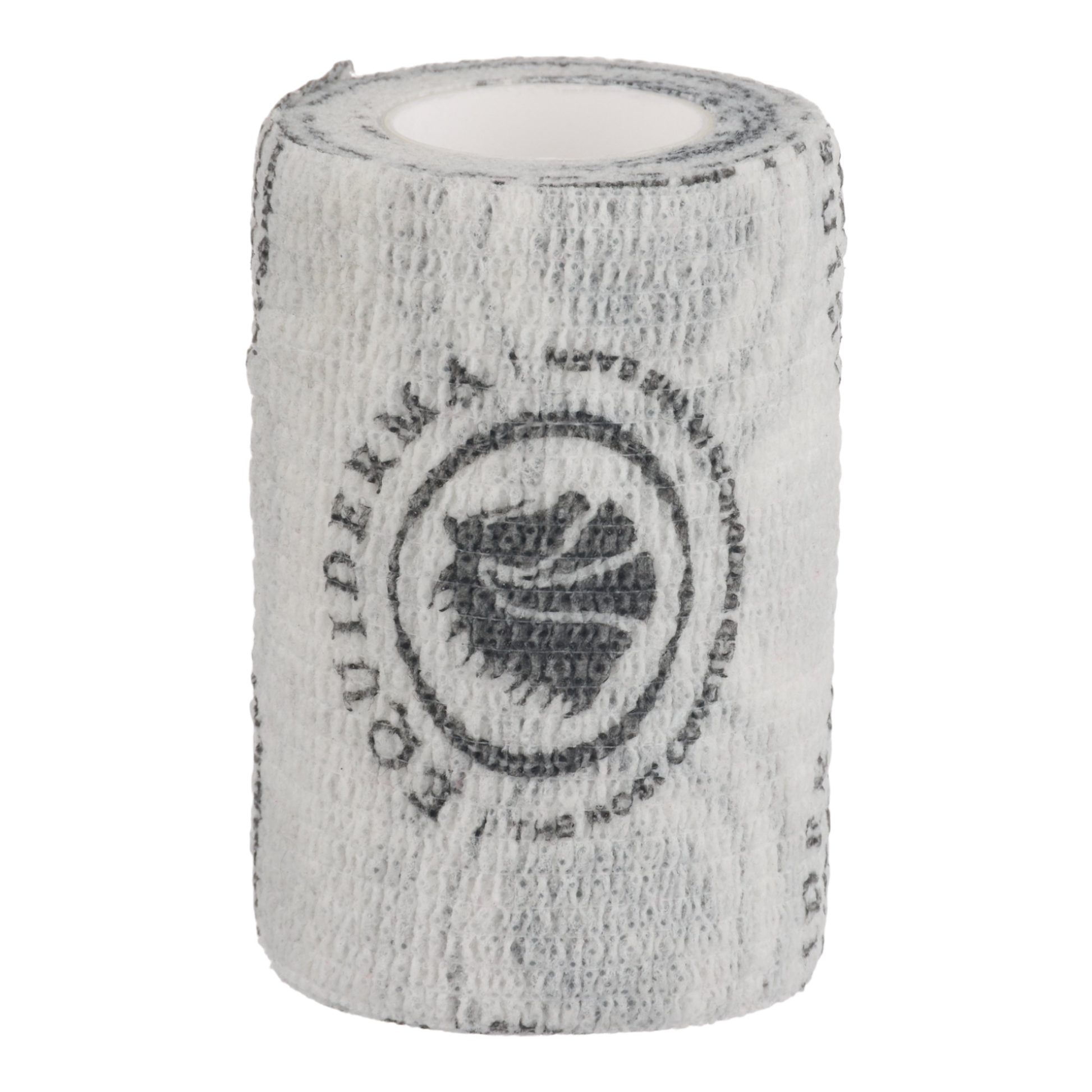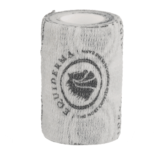 Self-adhering cohesive vet wrap bandage with Equiderma print, 7.5cm by 4.5m (approximately 3 inches by 15 feet). Linear elastic yarns deliver consistent compression without constricting, moving or falling off over time. Use to protect joints, cover wounds, and suppress bleeding. Sweat and water resistant, won't stick to skin or fur. Tears easily in a straight line, a must-have item in your tack box or emergency aid kit for all your animals.